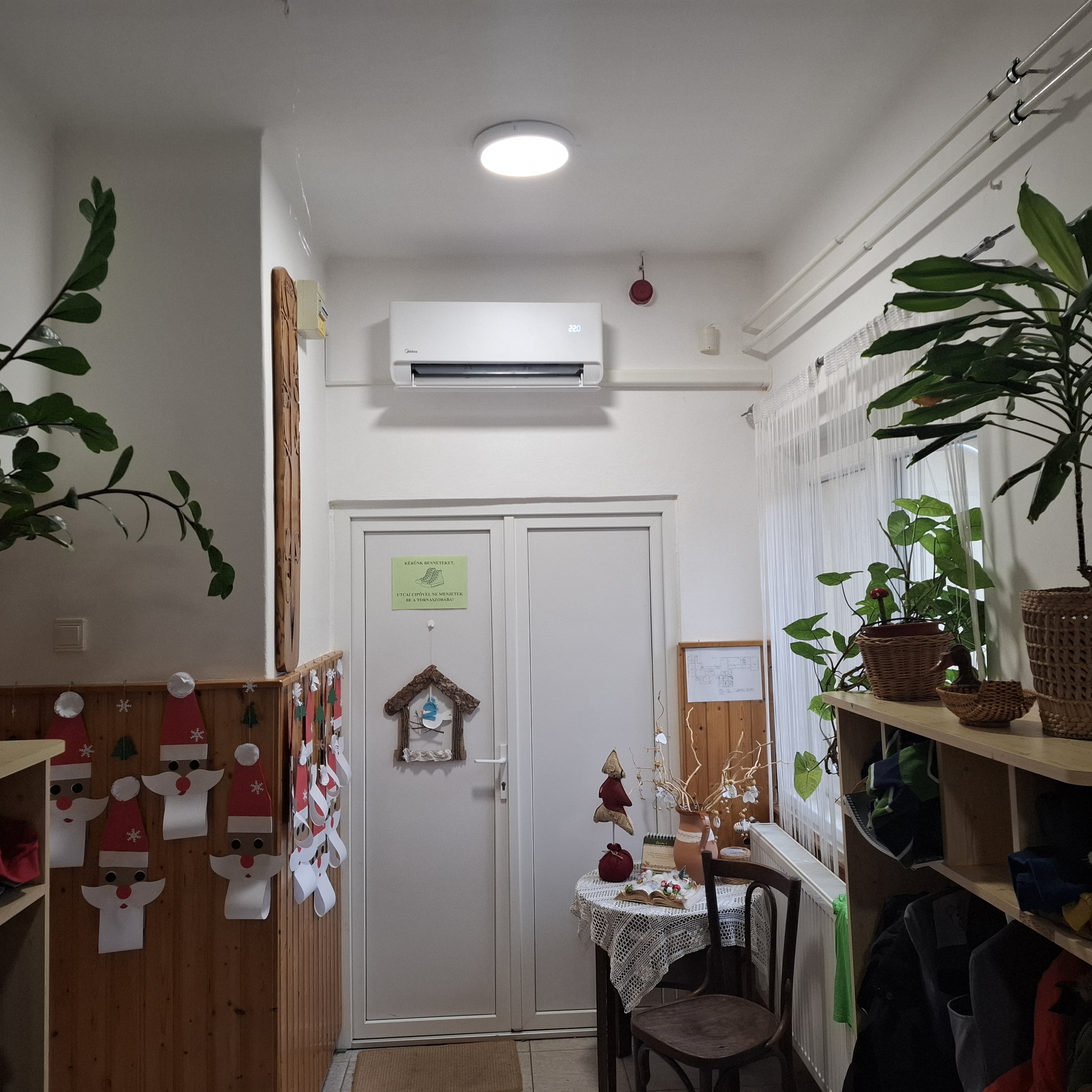 A héten beszerelték ez utolsó két klímát is az ovi előtereibe, így a gyermekeket akkor is kellemes hőmérséklet fogadja, ha nem megy a gázfűtés.